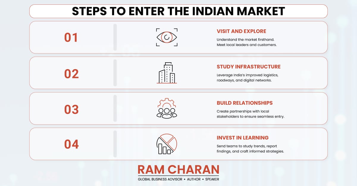 Success in India starts with learning. Visit the market. Meet customers, business leaders, and policymakers. Understand the local landscape and emerging trends. History shows the value of this approach: Jack Welch sent teams to India in 1982 to explore opportunities. Today, that investment has grown into billions.